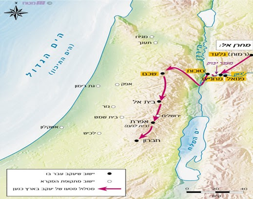 צא ולמד: מסע יעקב ומשפחתו מחרן אל חברון-הוא חזרה מהגלות לבית בכנען. המסע הוא גם רפליקה – העתק של מסע אברהם אבי האומה. שניהם באים מחרן אל ארץ כנען. האתר הראשון של אברהם הוא :"וַיַּעֲבֹר אַבְרָם בָּאָרֶץ עַד מְקוֹם שְׁכֶם עַד אֵלוֹן מוֹרֶה" (לך פרק יב). היעד החשוב של יעקב הוא שכם. שם הוא רוכש חלקת אדמה ומנסה לקיים יחסי שכנות. הכרזה על קביעות- הוא אינו גֵר ותושב. היעד הבא של אברהם הוא:"וַיַּעְתֵּק מִשָּׁם הָהָרָה מִקֶּדֶם לְבֵית אֵל וַיֵּט אָהֳלֹה בֵּית אֵל מִיָּם וְהָעַי מִקֶּדֶם וַיִּבֶן שָׁם מִזְבֵּחַ לַה' וַיִּקְרָא בְּשֵׁם ה' ". הוא המקום אליו הולך יעקב אחרי מעשה שכם. משם ממשיך אברהם דרומה :" (ט) וַיִּסַּע אַבְרָם הָלוֹךְ וְנָסוֹעַ הַנֶּגְבָּה"